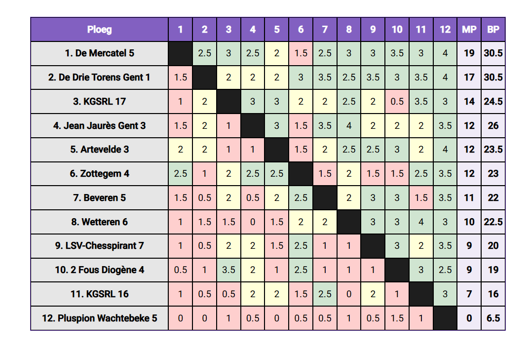 Derde tegen de eerste.Amir ging rap ten onder tegen Franky, voordat ik iets van zijn bord zag. Ik kreeg een remise voorstel van Christelle Kindts, ik had dan gene goede ontwikkelingszet met mijn dame gedaan (Dc2), zag de bui al hangen. Robin had al licht voordeel en Jeroen had ook licht voordeel. Robin kwam een stuk voor, maar door zijn onveiligheid van de koning, moet hij het stuk weergeven, dan had hij kwaliteit voor, maar zijne koning bleef onveilig staan, Izzy speelt het goed naar remise, tot ontgoocheling van Robin. Jeroen won een stuk tegen Ava, maar ook zijne onveilige koning veroorzaakt remise. Ik vocht terug naar wat mindere zetten van Christelle, ik won een pion, maar dat was nog niet genoeg voor te winnen, te veel achter blijvende pionnen, ze won een centrumpion terug (misschien zat er meer in voor haar), kreeg een vrijpion, wel gestopt door mijn koning, en een geforceerde vrijpion op de b-lijn. Dacht dan wel aan de veiligheid van mijn koning en met Tg7 kwam ik in winnende positie terecht. Ik maak het wel af (verdiend denk ik het niet), goed voor de ploeg zeker, kost de schade beperken op remise voor de ploeg.Wij blijven wel eerste staan, maar moeten de Mercatel 5 naast ons dulden.